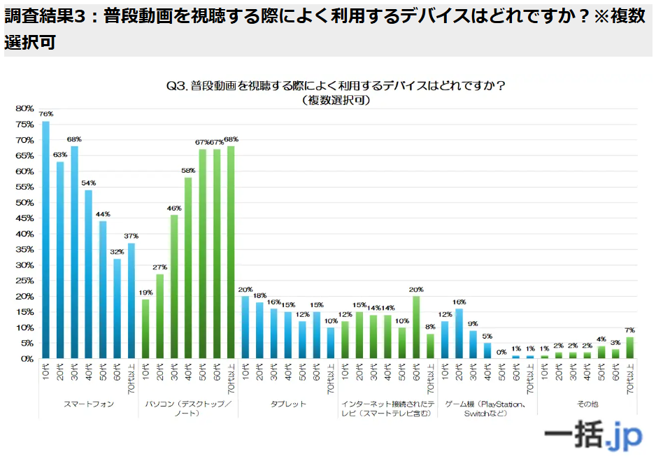 縦型ショート動画流行の1つ目の理由は、10〜30代を中心に動画視聴に使用するデバイスがスマートフォン主流になったからです。