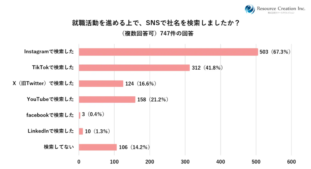 採用面に関して就職活動中の学生を対象に実施された調査では、SNSで社名を検索した就活生は85.8%にのぼり、採用活動においてもSNSが情報収集の場として機能していることがわかります。