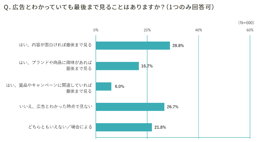 また、4割が『広告だと気づいた後でも、その動画が「面白い」または「自分に役立つ・興味がある」と感じられれば最後まで視聴する』と回答した調査結果もあります。